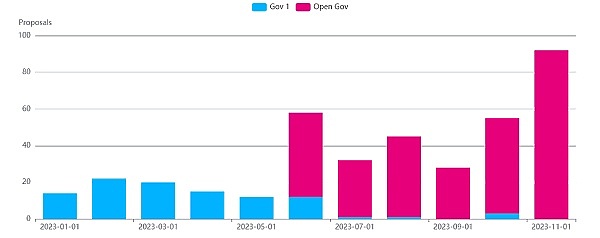 2、OpenGov的推出:2023年6月,OpenGov的推出对Polkadot的治理体系进行了改造,强调了社区直接控制和决策。这一举措加强了社区在Polkadot网络发展中的地位,促进了更的决策过程。OpenGov 的推出后,提案数量明显上涨。