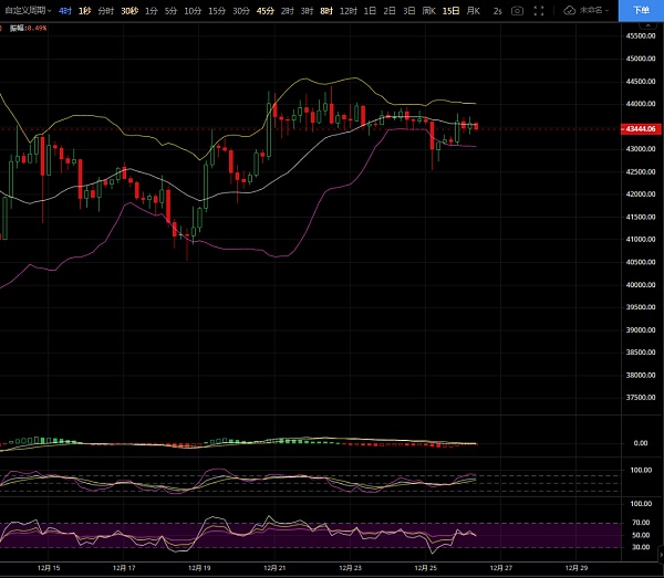 昨日大饼在早间一波插针下探后,日内行情整体走势偏弱,一直处于震荡横盘震荡走势,直至晚间多头逐渐发力一路上行,大饼晚间在冲高43850区域后形成窄幅区间震荡,整体走势较为走弱,但依然保持着越走越高的迹象,每次的拉升都伴随着缓慢的回落,由于走势较慢,无疑也是大大减少了我们的收益情况,同时昨日收益也比较可观,操作上没有给到太大的压力!现行情则稳定在43400附近震荡运行