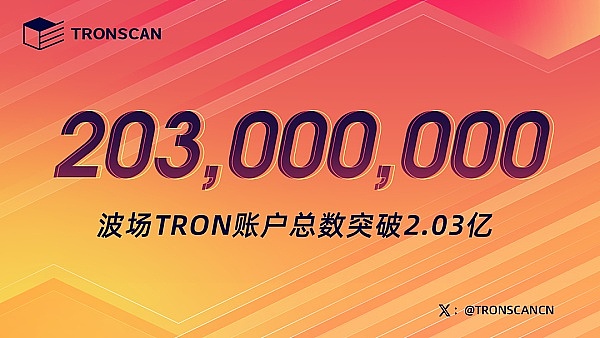 区块链浏览器TRONSCAN最新数据显示,截至2023年12月25日,波场TRON账户总数达到203,104,514,正式突破2.03亿。