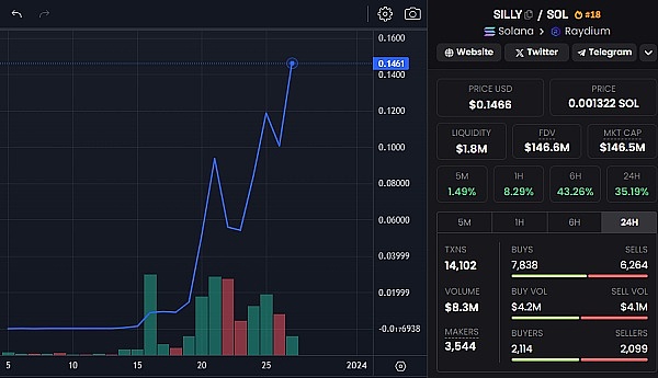 当前Silly价格是0.12美元,Silly是SOL链上铭文,涨幅惊人。随着SOL价格拉升,Solana生态铭文也如如火如荼进行中。