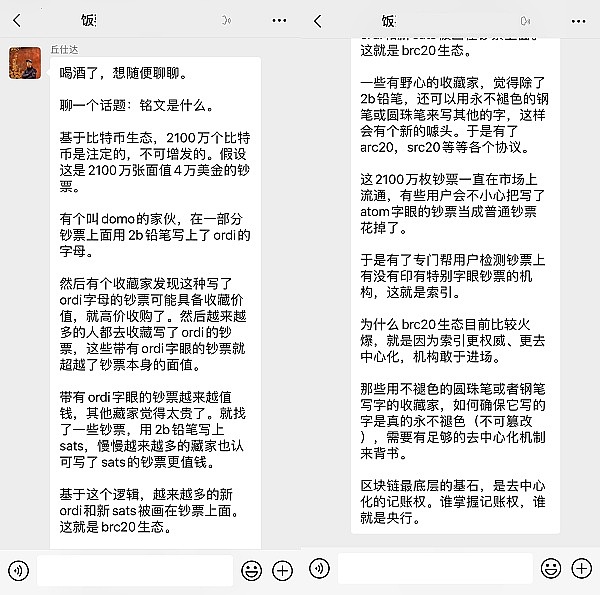 什么是铭文?通俗理解就是在比特币最小单位聪sat上铭刻信息,比如写入ordi、sats等文本,这些文本就是brc20,也有铭刻图片的,就是比特币NFT。