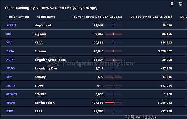 CEX 净流量价值排名的代币(每日变化):通过 CEX 的净流量价值来分析代币排名的每日变化,可以为投资者对 AI 和大数据领域代币的兴趣和信心提供有价值的见解。排名上升最显著的代币反映了投资者情绪的高涨和资本流入的增加,因此在剖析其驱动因素时值得关注。相反,排名大幅下降的代币则表明投资者资金外流,需要仔细检查持续时间和程度,以确定是否存在系统性风险。