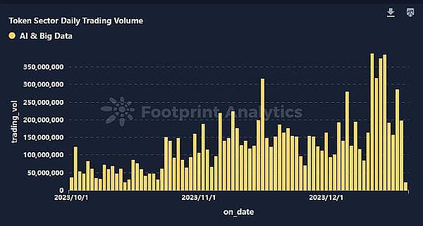 行业每日代币交易量:通过追踪 AI 和大数据领域代币的每日交易量,从 10 月到 12 月,我们观察到日均交易量呈显著上升趋势,并在 12 月中下旬达到 389,149,331 美元的峰值。这种激增反映了市场对 AI 和大数据领域的持续关注和资本输入,突显了该领域在加密货币市场中的重要性。