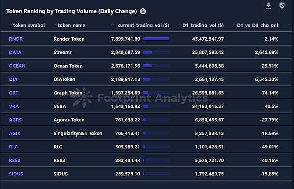该领域代币交易量排名(每日变化):通过 AI 和大数据领域内的交易量分析 Token 排名的每日变化,可以表明投资者对 AI 和大数据区块链领域内特定项目或技术不断变化的情绪和兴趣。