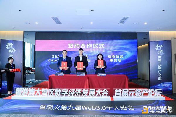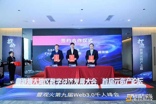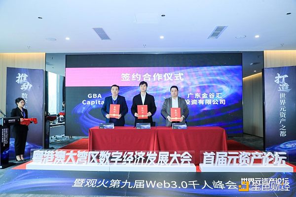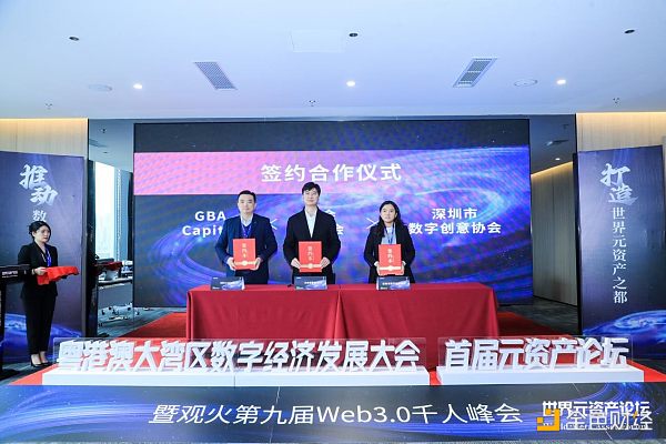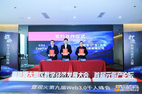 活动上还进行了多项签约仪式。大湾区资本集团(GBA Capital)、大会组委会先后与重庆两江新区明月湖建设领导小组、倍轻松轻松睡眠、DESS、和合(广东)文化投资有限公司、广东金谷汇投资有限公司、深圳市数字创意协会、超块链、华商律师事务所、中链数字资产开发服务(广州)有限公司等合作伙伴进行签约,未来将在数字经济、元资产、Web3.0、元宇宙等领域开展合作。