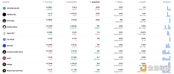 24小时NFT交易量、交易量前十项目 数据来源:Coinmarketcap