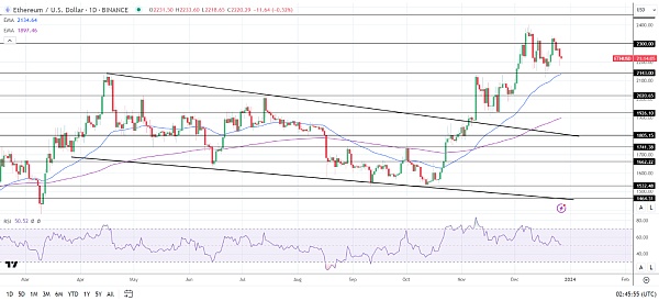 14周期每日RSI为50.52,表明以太币在进入超买区域之前将升至2400美元关口。