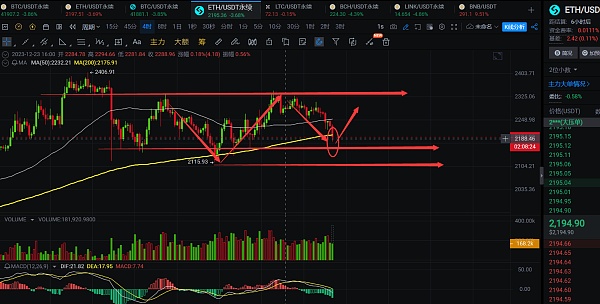 4小时线上看,以太在短线上方承压后走下跌,晚间下跌短线也是有一定的支撑的,以太的支撑区间是2200-2165,目前最低点在2179位置,到达支撑区间,晚间以太不跌破2115短线低点,基本上多头是安全的,以太晚间支撑点位关注2165附近,行情只要不破2115,收线到2165附近及上方,基本上反弹就没啥问题,反弹目标区间预计在2280-2310,到达后再关注高点2344破位情况,自行把握进场机会;短线交易,控制风险,盈亏自理;