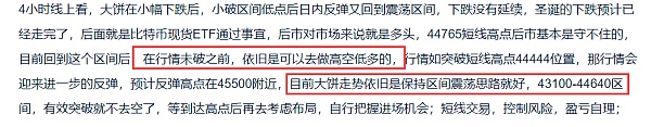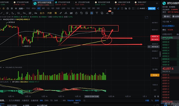 高位震荡的走势终于打破,晚间行情下跌到短线支撑附近,大饼这波支撑区间在42040-41400,目前价格低点在41619,晚间大饼只要不跌破前面低点40555位置,就可以去在41400附近做多单的布局,如行情下跌跌破41400,收下影线到41400附近以及上方,那基本上多单就没啥问题,马上1月了,这波下跌延续的机会不是很大,不过还是需要做好防护,晚间思路,围绕41400附近去做多单布局,反弹目标区间在43300-43800,到达后再去关注区间震荡高点的破位,自行把握进场机会;短线交易,控制风险,盈亏自理;