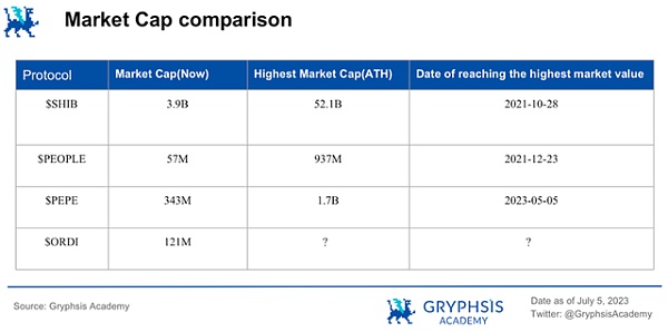 回顾过去的SHIB、People和PePe,它们在上线币安后都实现了较高的涨幅(早期投资者持有至上线币安时均有超过10倍的涨幅)。考虑到ORDI相对于SHIB等MEME的市值较小,并结合当前的情境,我们倾向于认为ORDI的市值状态尚未达到。