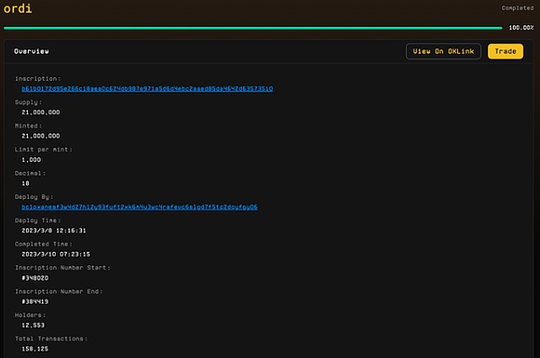 2023年3月8日,推特用户@domodata发布了实验性的可互换标准BRC-20。该协议利用Ordinal JSON数据进行的铸造和转移。BRC-20合约部署了名为“ORDI”的,每次铸币限制为1000个,总量为2100万个。