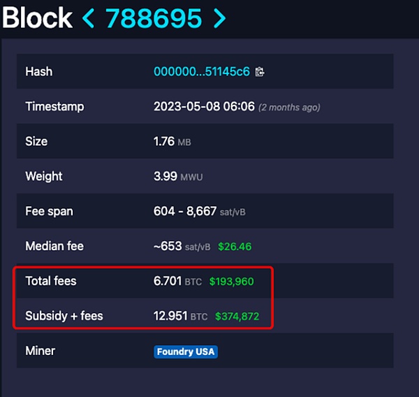 随着比特币最近交易费用的飙升,区块号788695对矿工来说是一个重要的里程碑。自2017年以来,单个区块的交易费用超过了分配给矿工的区块奖励。在这个特定区块中,交易费用达到6.7比特币,超过了6.25比特币的区块补贴。
