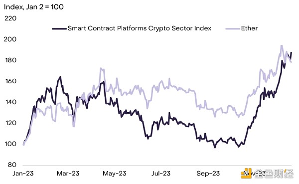 2023年以太坊表现强劲,但相对比特币以及一些其他智能合约区块链代币表现不佳。我们认为这反映了今年比特币特定的积极因素以及以太坊链上活动的较慢复苏。