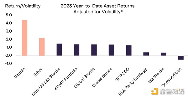 从更广泛的角度来看,尽管今年以太坊落后于比特币和某些其他加密资产,但从绝对价值和波动性调整的角度来看,它在很大程度上超过了传统资产类别(图表5)。因此,尽管今年其价格“仅”上涨了82%,但在我们看来,这一反弹应该被视为加密市场复苏范围扩大的证据。
