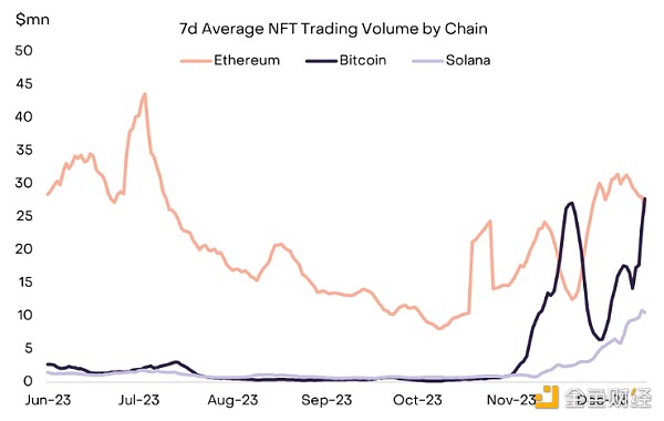 图表 4:比特币和 Solana 上的 NFT 活动不断增加
