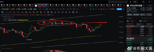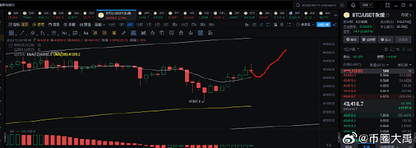 现货比特币ETF可能在2024年获得批准,这可能会改变人们对数字资产的看法,此前一年该行业面临着强烈反对。2024年,有两个可能的发展引人注目。首先,美国证券交易委员会批准现货比特币ETF可能会激发对数字资产的更多兴奋和支持,澄清监管不确定性和估值担忧。 其次,推动美国资本市场基础设施现代化符合数字一代对效率和透明度的需求。即将到来的T 1贸易结算截止日期等举措以及贝莱德首席执行官Larry Fink对代币经济驱动的市场未来的预测都强调了这一趋势。预计到2024年,对旨在实现这一改革的用例的机构支持将会增加,例如Figure对Provenance区块链的使用。技术面日线:48000目标不变,上行通道未变四小时线:这笔在上行到43800遇到了小级别的阻力,应当会回调至43000盘整一波,再继续向上冲15分钟线:盘整,能回调到43000上下两百刀就上车多单操作计划:42300多单继续持有