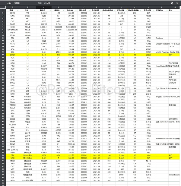 分析上一轮周期中出现的百倍币项目,我们可以参考 Rocky_Bitcoin 大神整理的数据。