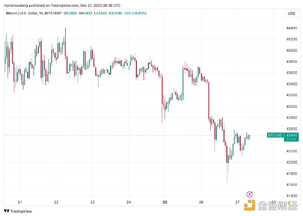 根据 Cointelegraph Markets Pro 和 TradingView 的数据,比特币在圣诞节期间可能已经低迷,跌至 41,650 美元的低点,但这种趋势可能很快就会改变。