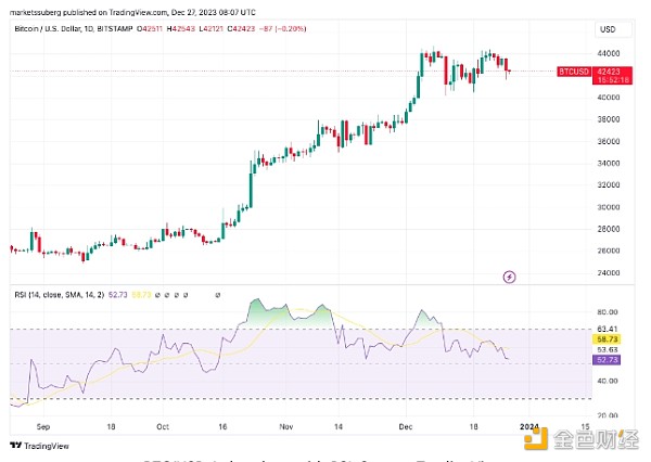 经典动量震荡指标可以洞察给定价格下 BTC/USD 的超买或超卖程度,该指标在 12 月下旬的每日时间框架上出现了一些重置。