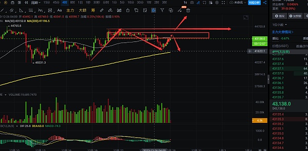 4小时线上看,大饼日内虽然也是给到反弹,但上方压力区间还是没有突破,大饼短线的压力区间是43370-43850,到达这个压力后,多单可以先做离场或者减仓带移动止损,后续关注短线高点44444位置的破位,如突破,大饼将进一步刷新高点,现在市场都在反弹,加上1月ETH审核通过,就算到了压力位43850附近后,开空也要轻仓控制好风险,43850附近收上影线,就说明压力有效,短线将会走一波回调,回调区间预计在42470-42100,到达该区间再去根据走势多,晚间关注压力43850到达以及收线情况做布局,多可继续持有到压力附近,自行把握进场机会;短线交易,控制风险,盈亏自理;