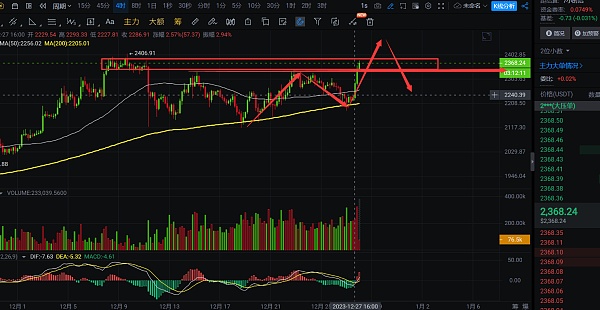 4小时线上看,以太的反弹晚间更猛一点,前面两次到达2330附近压力后开始回调,这波反弹直接拉升突破,上方虽然也是有一定的压力,但是压力的力度不强,以太晚间已经走出突破行情,预计下个到达点位在2435附近,再度刷新短线高点2406位置,到达该位置后根据以太具体的收线情况来去考虑空单的布局,如以太到达2435附近,大饼刚好到达43850压力附近,基本上就可同步开空,以太回调区间预计在2275-2235,短线上多单离场的可以先观望一下,虽然上方还有空间,但空间不大了,关注高点压力到达后收线情况再做布局,自行把握进场机会;短线交易,控制风险,盈亏自理;