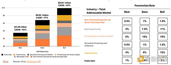 4、3.5-10万亿美元:预计到2030年,全球代币化资产的市值规模将在熊市情况下的3.5万亿美元和牛市情况下的10万亿美元之间。该市场价值是根据各种资产类别的总可寻址市场的估计渗透率得出的。