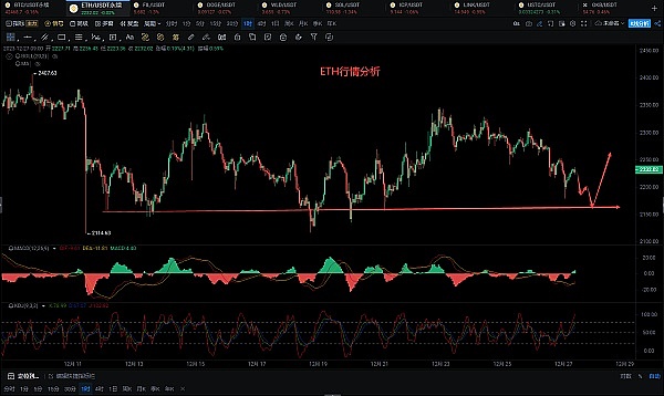 以太昨晚破掉2200,来到2180,短期上涨可能性降低,白盘预计要在底部试探支撑,支撑区域在2150—2180,现在是小时线中轨压制2235附近,建议可以短空,目标看50点;回踩2150—2180区间我们择机做多,目标上看80—100点。全网公开,思路清晰,点位精准,欢迎点赞评论。单丝不成线,独木不成林,与其一个人的单打独斗,还不如选择跟随,用众人之力,则无不胜也。