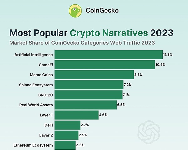 CoinGecko:AI、GameFi和Meme Coin为2023年三大加密叙事
