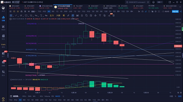 以太坊在昨天早间走出了2455高位后开始回踩,晚间虽有反弹2415附近但奈何上行势能较弱,刚刚最低跌至2310附近后开始反弹,现行情位于2330附近震荡。