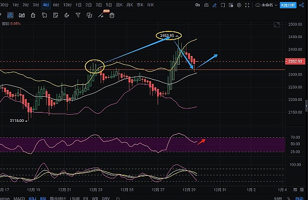 当前看下12.29号以太坊日线级别走势,价格K线昨日收线上影下吊线高点在2453附近冲高回落。K线整体并没有跳出布林带上轨,所以价格自然短期回落。下方颈线2320附近如果能支撑短线回调趋势,那么整体上升趋势线仍就完好,做多预期会再次浓郁起来。