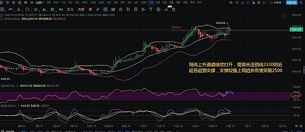 如果多头上升趋势短暂整理后延续上攻,相信盘中的回调也会随之加大深度和回踩速度,当前技术指标方面RSI在70值多头范围虽有波动下行,但整体高点并未下移,仍在中轴线50值上方。那么盘中最大回踩深度可能也仅限于布林带日线中轨上方2310--2280范围会止跌反弹