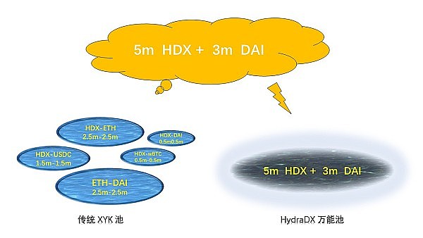 在传统 XYK 池环境里,假设市场上有价值 $500 万的 HDX 和 $300 万的 DAI,添加在了 5 个不同的池子里: