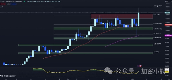 Celestia代币(TIA)今天经历了巨大的涨幅,TIA价格上涨近40%,达到了16.8135美元的历史新高。这次突破是在TIA经过三周的盘整之后出现的,这表明决定性的上涨可能已经开始。