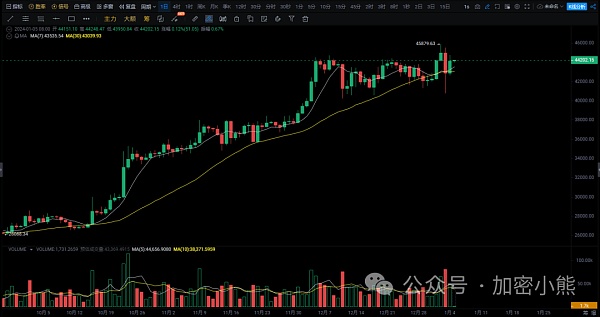 昨天,比特币在白天经历短暂整理后,下午开始在小时级别形成小幅震荡上涨。晚间10点,两根1小时级别的阳线迅速冲破44000关口。当前,比特币可能迎来一波调整,回撤至1小时级别的趋势线附近,之后预计将继续上涨。建议在低位寻找买入机会。