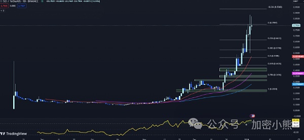 在昨天创下0.8828美元的历史新高后,SEI价格今天在0.79美元的水平附近保持盘整。由于加密货币目前长时间处于超买区域,SEI价格可能会经历一轮回调。SEI价格的20天均线为0.5211美元,远低于0.37387美元的50天均线,暗示了短期内的强劲看涨趋势。此外,EMA之间的差距结合超买的RSI表明未来可能会有波动。