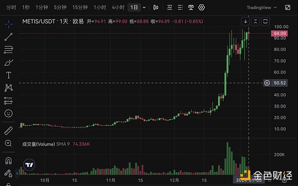 1月5日,OKX行情显示,METIS 上涨至99美元,随时可能进入百元币种俱乐部。而Metis Andromeda TVL也在12 月 28 日后再次超越 Base 成为第三大以太坊 Layer 2。