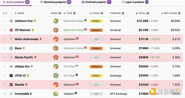 同一时间,Goerli 测试网上坎昆升级时间确定为 1 月 17 日,这无疑为L2赛道再添利好。但竞争也随之加剧,L2前十争夺战展开激烈角逐,除前2名的Arbitrum、Optimism地位遥遥领先外,3-10名间TVL差距不大。