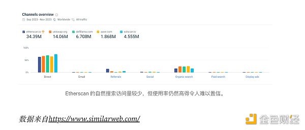 如此强大的功能为用户带来了如此多的便利,使其成为加密生态系统中使用最多的网站之一。以下是过去 3 个月 Etherscan 网站和其他热门 DeFi 网站使用情况的快速比较: