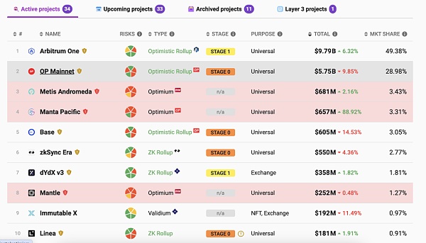 Layer2 TVL前十排名,来源:L2 Beat