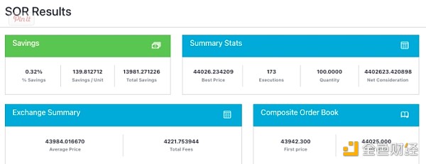 因此,发行方必须在报价现金金额之间维持较小差价的目标与以该报价金额或更优价格进行交易的能力之间进行平衡。然而,要实现这一目标,需要使用先进的技术。以在Coinbase上的流动性为基础的100比特币的报价与使用在美国受监管的4个交易所(Coinbase、Kraken、Bitstamp和Paxos)的策略之间的差异可以作为一个例子。此示例使用了CoinRoutes Cost Calculator(通过API提供),该计算器显示了基于内存中保存的完整订单簿数据的单个交易所或任何自定义交易所群组的交易成本。