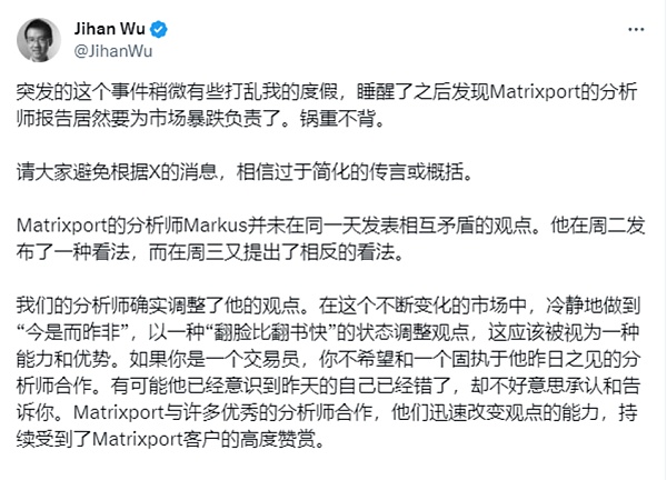 他表示,Matrixport 的分析师 Markus 并未在同一天发表相互矛盾的观点。Markus在周二发布了一种看法,而在周三又提出了相反的看法。我们的分析师确实调整了他的观点。
