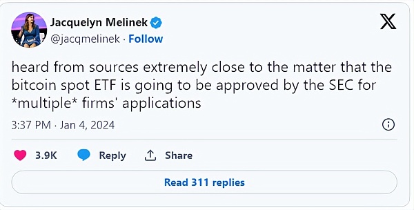 关于Crypto X的多条推文引发了人们对比特币ETF现货可能在周五(1月5日)获得批准的希望,尽管一些分析师认为这不会这么快发生。