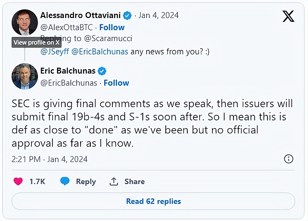 同样,律师兼商业诉讼律师Joe Carlasare指出,数个ETF申请的公众评议期要到1月5日午夜才结束。