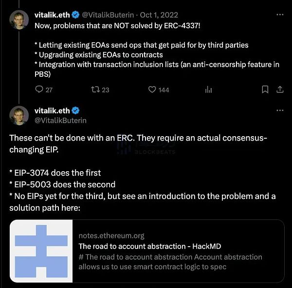 因此,EIP-3074 通常与其他账户抽象提案(如 EIP-4337)相比,被看待得较为不利。