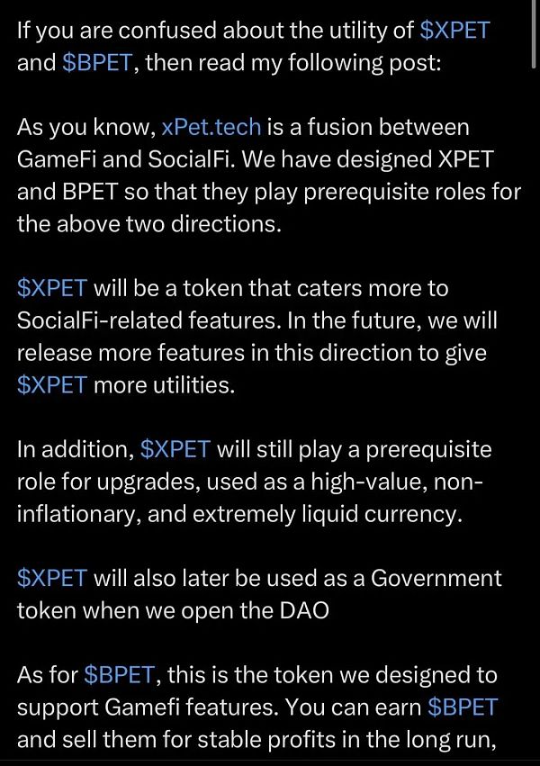 我们设计了XPET和BPET,使它们在上述两个方向上起到先决角色。XPET将是一个更适用于与SocialFi相关功能的代币。在未来,我们将发布更多在这个方向上的功能,以为XPET提供更多的实用性。