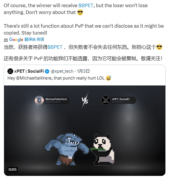 对于胜负的奖励和惩罚,官推也给出了答复,那就是获胜会得到Bpet,失败者不会失去任何东西,至于失败者能得到什么,官推并没有说,说是怕被抄袭哈哈,那就让我们拭目以待吧。