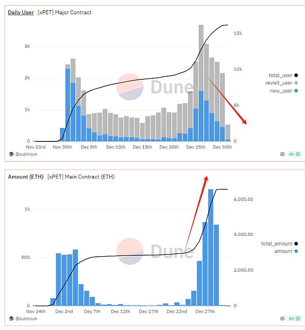 12月25-12月29日这波暴力拉升,就非常的冥想,用户新增量在12月26日到达顶峰,之后两天开始减少。而12月27-12月29日链上出现巨量的借贷,最后币价到达3.25U后闪崩到1.35U。