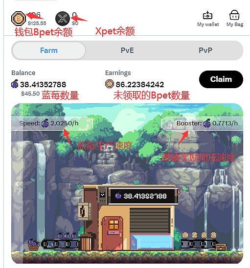 1、左上角是Bpet钱包余额,这里面包含了奖励的Bpet,这部分是你自己充值进来的数量,可以用来升级宠物,房子,买食物。2、Xpet钱包余额,可出售。3、Balance(蓝莓余额): 这个可以理解为矿石,不是币,也没有上链。4、Earnings:已挖出来但未领取的Bpet数量。