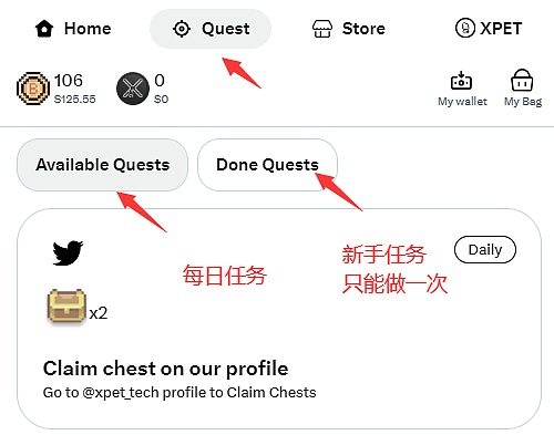 一天可以开2-7个宝箱,如下图,点击这里,主要是找官推,知名人物比如Musk,基本会在他们推文头像下面有一个箱子,我的头像下面也经常有(Q先生推特地址:https://twitter.com/sa1ntc2k4),有推友说只要推文里面有Xpet字样就会有,但显示时间或规律目前不清楚,但容易刷到。
