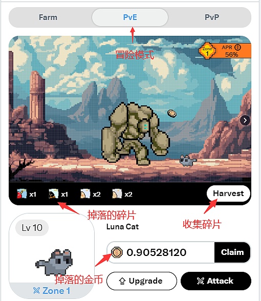 宠物升级到10级以后还可以参与PvE冒险模式,通过冒险模式会掉落Bpet以及各种碎片,碎片可以合成相应的NFT,后期很有可能会变现。【切记】掉落的Bpet金币暂时先不要领取,后期等宠物和工厂等待级别高了再去领取,这里的Bpet领取之后宠物会自降三级。
